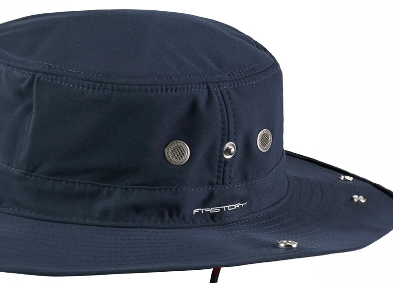 Cappello Musto con rivestimento idrorepellente a lunga durata per favore la fuoriuscita dell'acqua per tempi di asciugatura più rapidi, fattore di protezione dai raggi ultravioletti UPF40, coulisse regolabile che lo mantiene al sicuro dal vento e chiusura a bottone per sollevare la tesa all'occorrenza.
