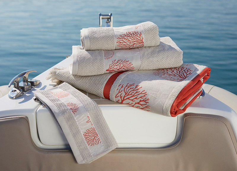 Questo articolo, perfetto per essere utilizzato sul ponte della barca, è decorato con frange e presenta degli eleganti coralli disegnati.
