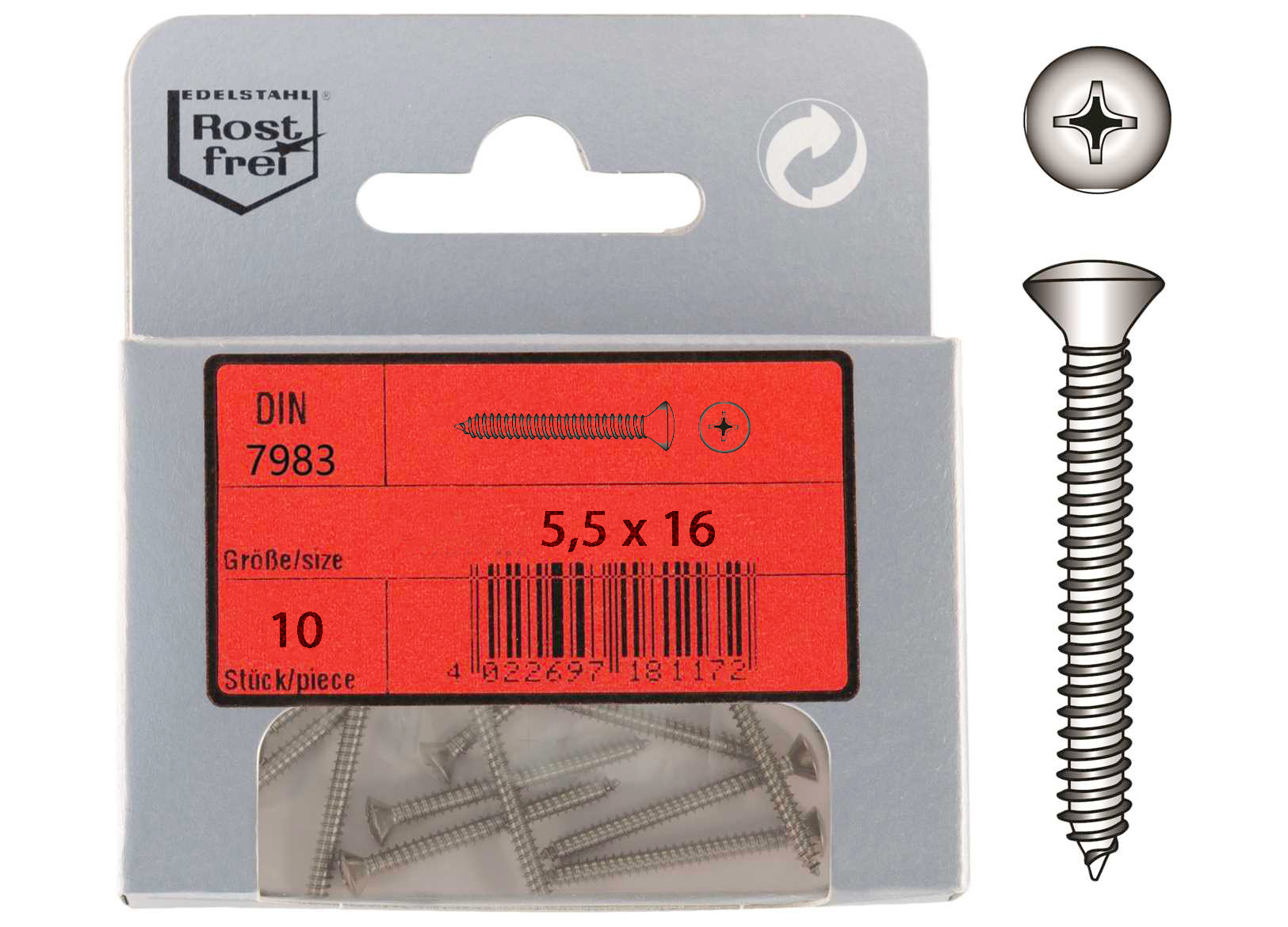 Viti autofilettanti a testa svasata con calotta DIN 7983 in acciaio inox A4, ø5,5 mm confezionate in comodi blister.